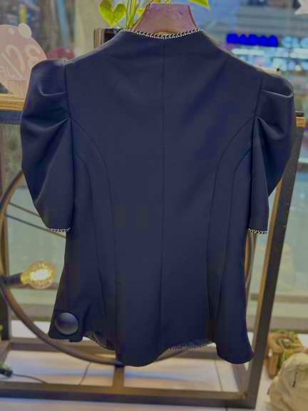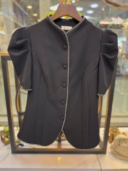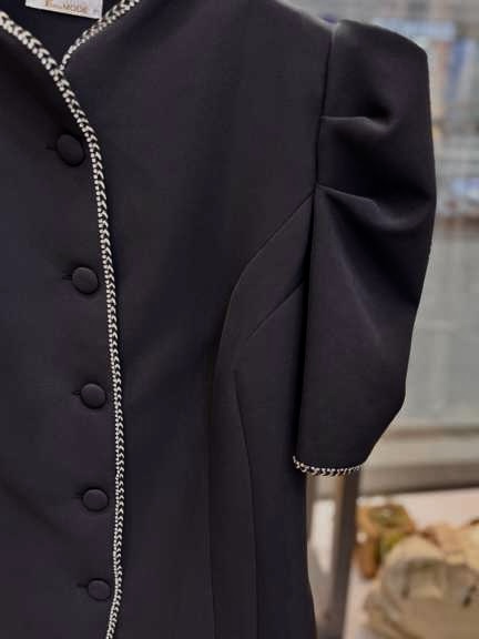 جنس کرپ دبل این کار، ایستایی عالی و مجلسی دارد و ظاهر شومیز کت را حرفهای نگه میدارد. جزئیات نواردوزی در قسمتهای مختلف، ظرافت و زیبایی کار را دوچندان میکند و با تکرنگ مشکی، ست کردن آن با انواع شلوار و دامن آسان است.